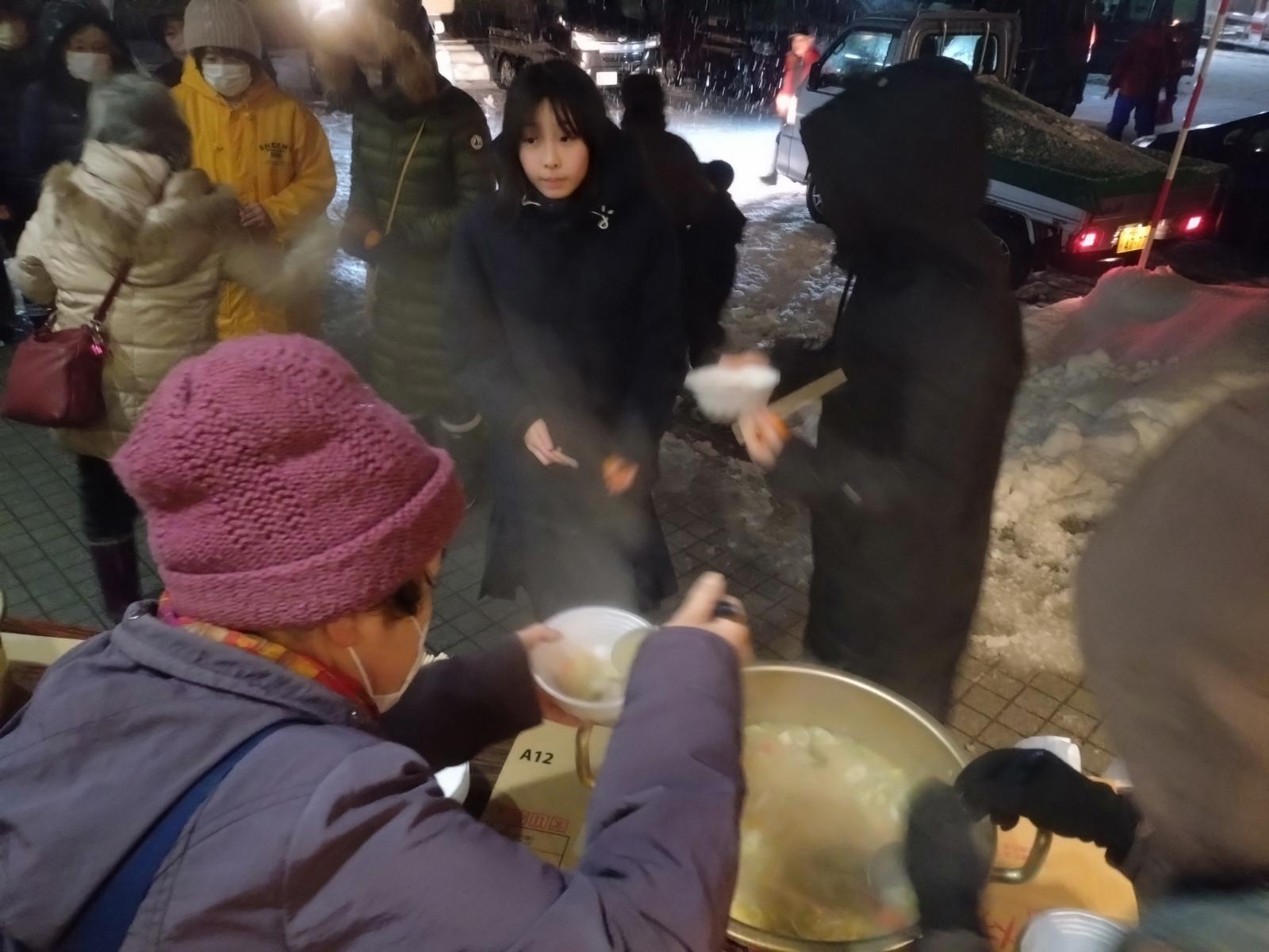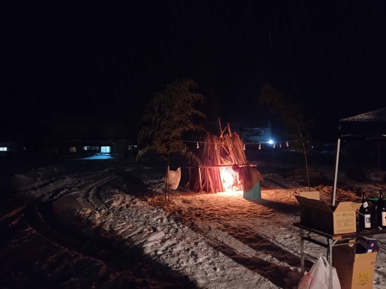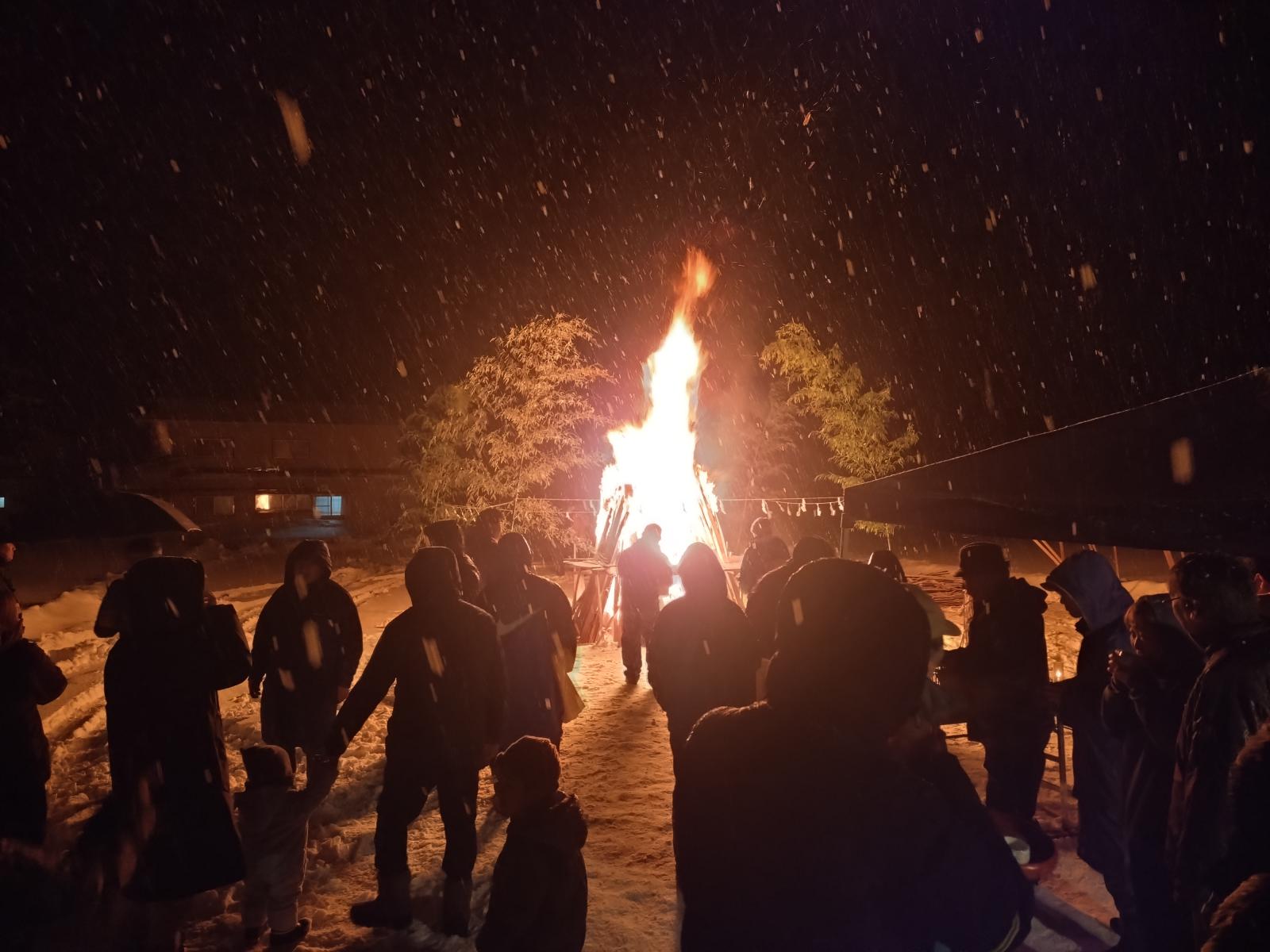 2026.01.15 藤琴地区活動推進協議会主催「どんど焼き」 【まちのできごと・みんなのわだい(web版)】 1月15日(木)、藤里町総合開発センターグラウンドにて、藤琴地区活動推進協議会主催の「どんど焼き」が行われました。 会場では藤琴婦人会による温かい豚汁もふるまわれ、雪の降る中参加した人々を喜ばせていました。 この日は藤琴地区の住民が正月に使ったお飾りなどを持ち寄り、宮司によるご祈祷の後、お焚き上げが行われると、集まった人々は炎を見上げながら今年一年の平穏を祈っていました。 ページ上部へ
