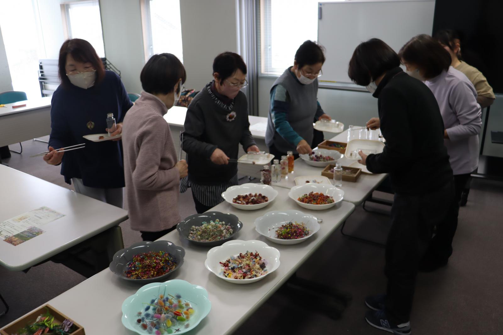 今回の講座のテーマとなった「ハーバリウム」は、ドライフラワーやプリザーブドフラワーを専用のオイルに浸してガラスに閉じ込めて作る雑貨で、当日参加した人たちは、講師の説明を聞きながら、思い思いの作品を仕上げていました。