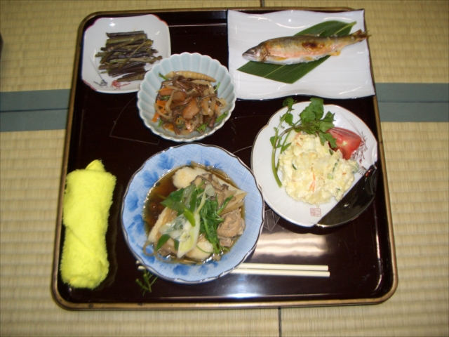 藤里で捕れたアユや、だまっこ鍋、ゼンマイとタケノコの煮物など、藤里の恵みが詰まったお膳。ここでしか食べられないものばかり。