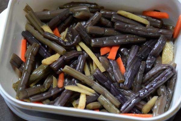 ノリ子さん:塩ワラビを漬けると、ツルツルしておいしいよ。アクが強くて黒い汁が出るので、その汁を捨てて4度も取り替えるの。取り替えれば取り替えるほどいいよ。ショウガ、ニンジン、今回は入れていないけれどダシ昆布をはさみで切って、あとは味道楽(秋田で常備している人が多いダシしょう油)と塩ちょっとで和えます。