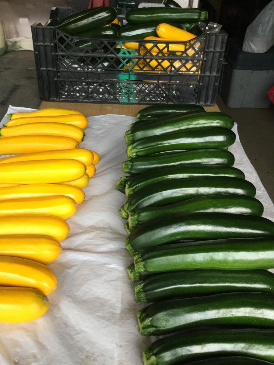 ほとんどの野菜は自分でできる範囲で産直だけに出してる。ズッキーニはハチに任せとくと、きれいな形にならない、だから、毎朝、花が閉じる前に受粉してやって、その受粉が大変なのよねー。ハチはいるか、いないかは、わからないでしょう。受粉してあげないと、きれいな形にならないのよ、ボコッっとなったり・・・。栽培している人は、みんなこういう苦労あると思う。