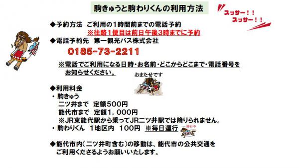 ・二ツ井駅からのタクシー予約・料金等 ・デマンド型乗り合いタクシー駒わりくん予約 詳しくは 0185-73-2211(第一観光バス株式会社)へお問合せください。 |