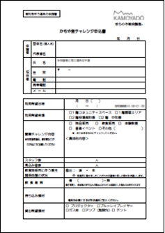 「かもや堂チャレンジ」予約申し込み 藤里町役場 総務課 企画財政係 TEL:0185-79-2111 FAX:0185-79-2293 Mail:kikaku@town.fujisato.lg.jp ※営利を伴う申込みの場合は役場へ申込みを してください。 ※保健所等へ提出した書類がある場合は、 書類の写しを添付してください。 ・Word形式 (WORD,43.09KB) ・PDF形式 (PDF,341.24KB) ページ上部へ