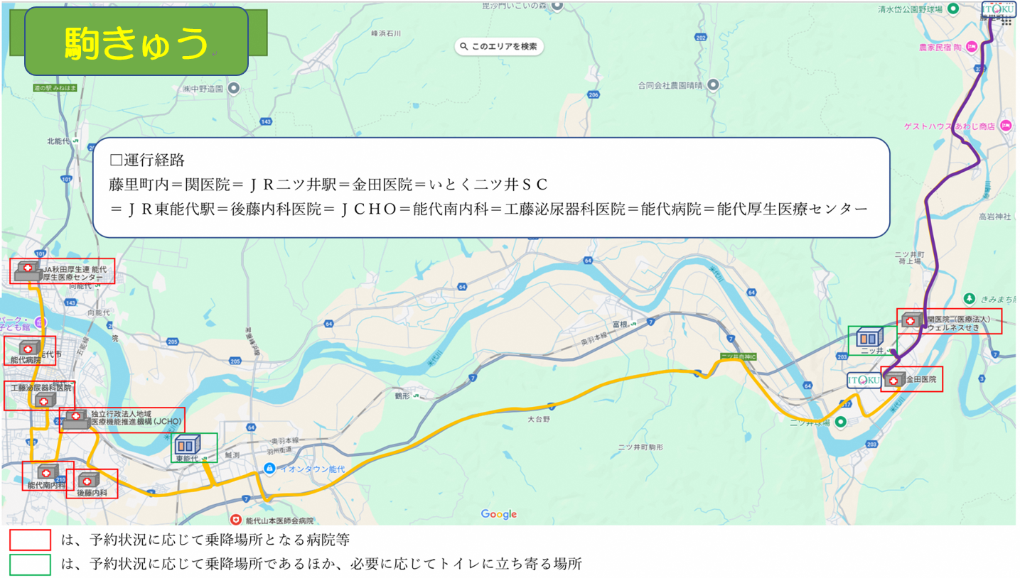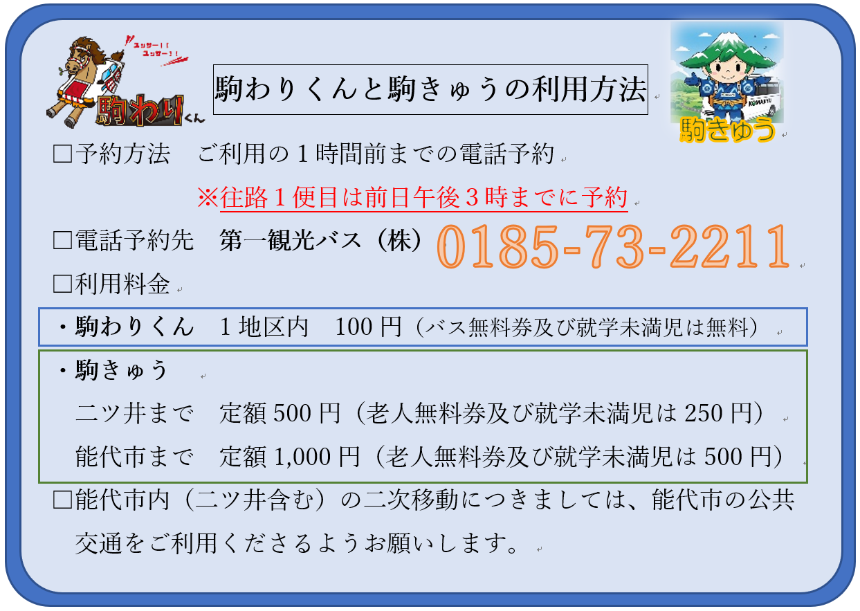 バス路線の廃止や縮小に伴い、令和7年10月1日より、藤里町における主要な公共交通手段がデマンド型乗り合いタクシーとなり、町内の移動は『駒わりくん』、町外(能代市)への移動は『駒きゅう』となります。デマンド型乗り合いタクシーは、町民の他一般の方もご利用できますが、運航時刻の1時間前までのご予約が必要となっております。